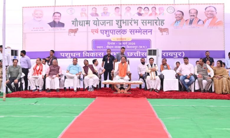 बिलासपुर, 14 मार्च 2026: मुख्यमंत्री श्री विष्णु देव साय ने आज काठाकोनी लाखासार पहुंचकर राज्य सरकार की महत्वाकांक्षी गोधन योजना का विधिवत शुभारंभ किया। मुख्यमंत्री का हेलीपैड पर भव्य और आत्मीय स्वागत किया गया, जिससे पूरे क्षेत्र में उत्सव का माहौल बन गया। केंद्रीय राज्य मंत्री श्री तोखन साहू और कृषि मंत्री श्री राम विचार नेताम भी इस ऐतिहासिक अवसर पर मुख्यमंत्री के साथ मौजूद रहे।